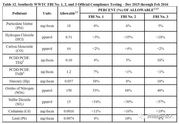 改造完成后,官方于2015年底至2016年出進(jìn)行了為期三個(gè)月的尾氣測(cè)試,最終結(jié)果顯示,經(jīng)過改造后,Southerly污泥焚燒廠的尾氣排放值完全滿足新標(biāo)準(zhǔn)中關(guān)于“已建流化床焚燒爐”尾氣排放的要求。下表數(shù)據(jù)中的百分?jǐn)?shù),表示實(shí)測(cè)濃度與排放限值的比例。