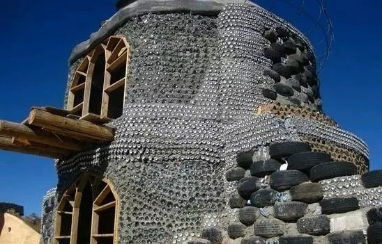 這是美國建筑師麥克·萊諾茲的作品。他的作品外形千奇百怪,而且都遵循著同一種理念:不需任何外接水電排污系統(tǒng),能夠自己發(fā)電,調(diào)溫,生產(chǎn)食物,收集循環(huán)用水;基本建材全是垃圾,廢棄輪胎、易拉罐、飲料瓶等。他給它們起了個名字:地球之舟Earthship。圖中的房子用輪胎和瓶子筑成的墻非常厚實,足以抵抗九級地震。