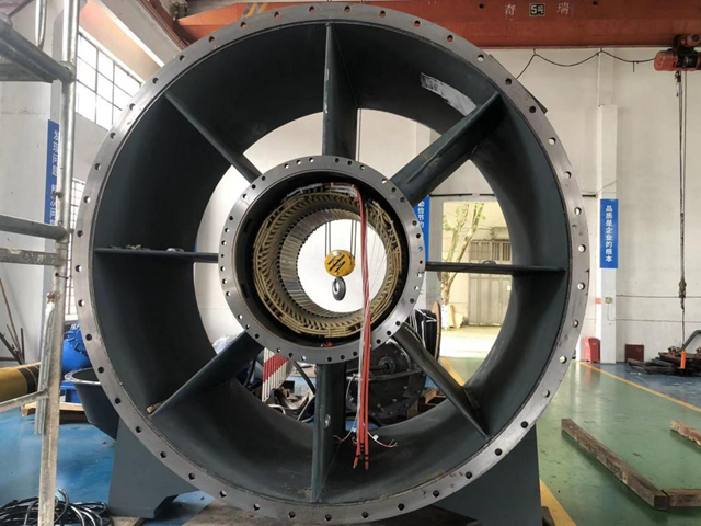 隨著工作人員進行運輸固定,首批2臺套高效高壓軸流潛水電機也即將交付。