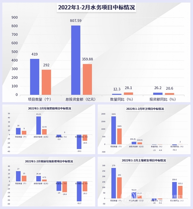 從上述圖表來看,2022年前兩個(gè)月,環(huán)衛(wèi)中標(biāo)項(xiàng)目最多,水務(wù)中標(biāo)金額最大,餐廚垃圾的同比下滑最多,土壤修復(fù)2個(gè)月的投資額同比增幅均超過了110%,1月更是達(dá)到了150.6%,而同時(shí)中標(biāo)數(shù)量卻是下降的,堪稱“完美逆襲”。