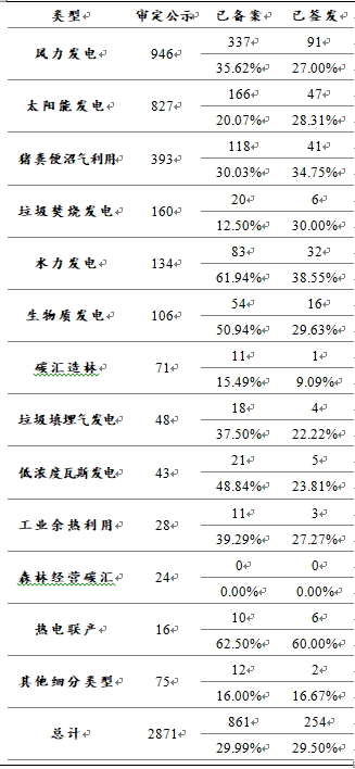 CCER開發(fā)中最主要的項(xiàng)目類型為可再生能源利用,其又可進(jìn)一步細(xì)分為風(fēng)力發(fā)電、太陽能發(fā)電、垃圾焚燒發(fā)電、水力發(fā)電、生物質(zhì)發(fā)電和地?zé)峁┡?。農(nóng)業(yè)項(xiàng)目則包括豬糞便沼氣回收利用、禽類糞便利用和畜牧類糞便利用。此外,碳匯造林、低濃度瓦斯發(fā)電、工業(yè)余熱利用、森林經(jīng)營碳匯、熱電聯(lián)產(chǎn)等類型也均有10個(gè)以上的審定項(xiàng)目。備案項(xiàng)目的類型分布與審定項(xiàng)目基本一致,風(fēng)力發(fā)電、太陽能發(fā)電、豬糞便沼氣利用位列前三。林業(yè)碳匯項(xiàng)目受到氣候、降水等不可控因素影響,項(xiàng)目實(shí)施過程可能與初始設(shè)計(jì)存在偏差,且項(xiàng)目前期產(chǎn)生的碳匯吸收量較少,因此截止2017年CCER備案暫停時(shí)其整體簽發(fā)率較低。