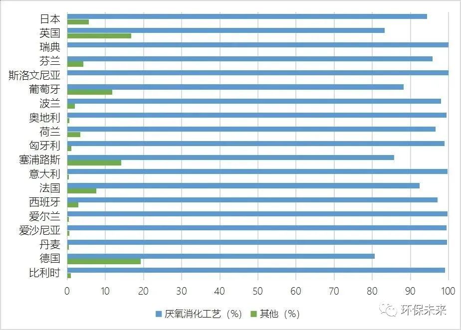 由圖1可以看出,目前發(fā)達(dá)國家的廚余垃圾處理技術(shù)主要以厭氧消化為主,約占市場份額的9成左右。其主要原因是相比于堆肥等其他處理技術(shù),厭氧消化技術(shù)更加環(huán)保和先進(jìn),受到業(yè)內(nèi)的廣泛關(guān)注,逐步形成一套成熟的產(chǎn)業(yè)鏈,進(jìn)而得到市場的認(rèn)可和推廣。