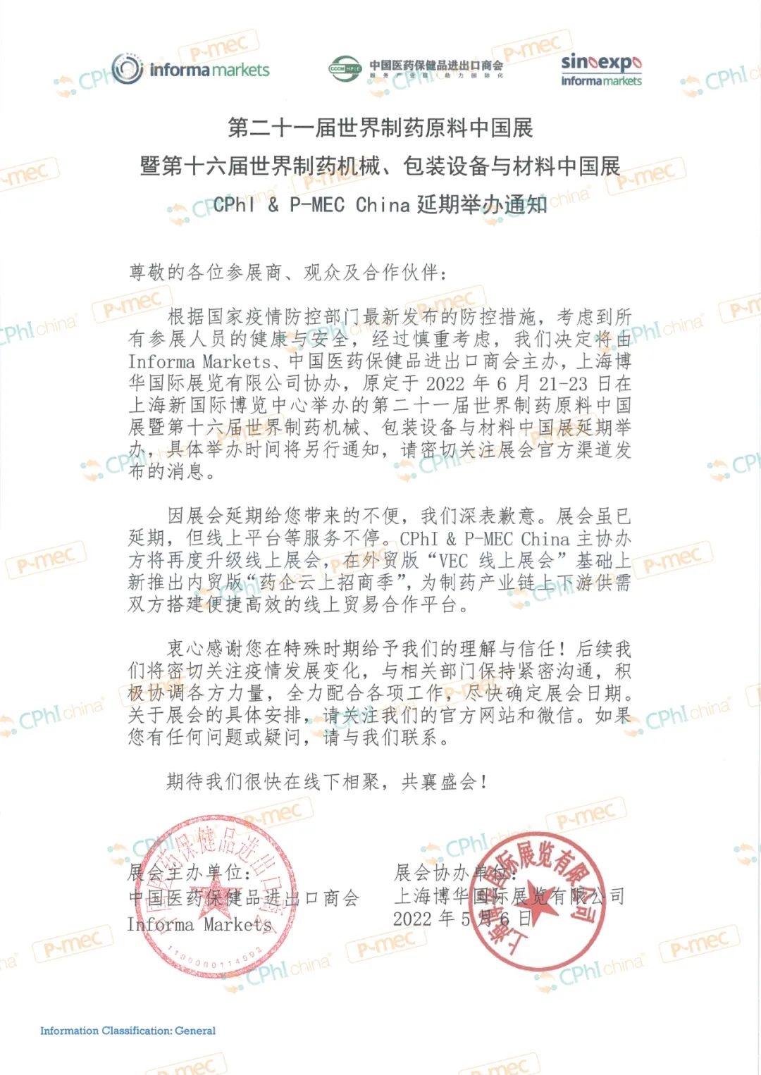 根據(jù)國家疫情防控部門最新發(fā)布的防控措施,考慮到所有參展人員的健康與安全,經(jīng)過慎重考慮,我們決定將由Informa Markets、中國醫(yī)藥保健品進出口商會主辦,上海博華國際展覽有限公司協(xié)辦,原定于2022年6月21-23日在上海新國際博覽中心舉辦的第二十一屆世界制藥原料中國展暨第十六屆世界制藥機械、包裝設(shè)備與材料中國展延期舉辦,具體舉辦時間將另行通知,請密切關(guān)注展會官方渠道發(fā)布的消息。