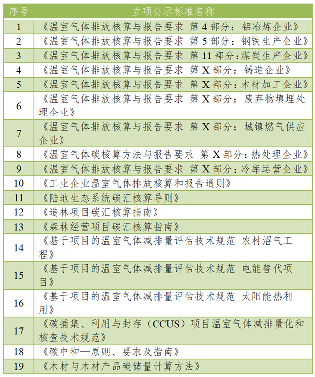 國家市場監(jiān)督管理總局對《溫室氣體排放核算與報告要求 第4部分:鋁冶煉企業(yè)》等10項溫室氣體碳核算標準,《陸地生態(tài)系統(tǒng)碳匯核算導則》等3項碳匯核算標準,《基于項目的溫室氣體減排量評估技術規(guī)范 農村沼氣工程》等4項碳減排標準,以及《碳中和—原則、要求及指南》《木材與木材產品碳儲量計算方法》等標準進行立項公示。具體見下表。