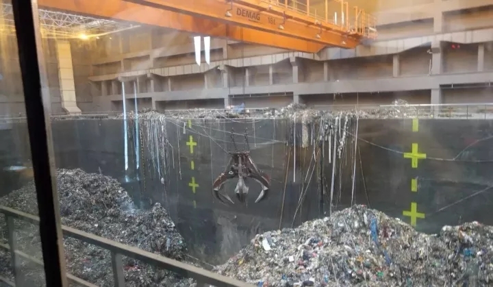 首先,生活垃圾運(yùn)輸車經(jīng)地磅稱重后,由上料坡道進(jìn)入卸料大廳。在垃圾吊控制室的統(tǒng)一指揮下,運(yùn)輸車將垃圾由指定卸料門卸入垃圾池內(nèi)。垃圾池采用全封閉性設(shè)計(jì),氣壓為負(fù)33pa,有效防止了臭氣外逸。垃圾池上方有四臺(tái)垃圾吊抓斗(三用一備),每臺(tái)容積為12立方米,是目前國內(nèi)最大的單體抓斗,采用手動(dòng)+半自動(dòng)式操作將抓取的垃圾從池內(nèi)送入進(jìn)料口,進(jìn)入焚燒爐焚燒。