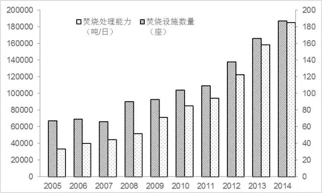 近年來我國城市生活垃圾焚燒處理設施投入運行數(shù)量逐年增加,焚燒處理能力也有非常大的提高。