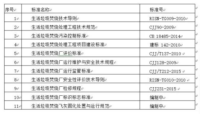 下表為近年來關于生活垃圾清潔焚燒標準和評價體系的標準規(guī)范等。