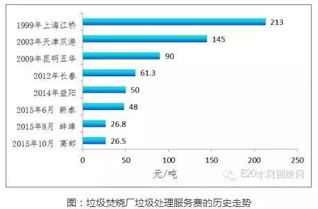隨著中國城市化的加速,城市人口大幅增加,城市垃圾量也急劇增多,當前,城市生活垃圾累積堆存量已達70億噸,而全國垃圾年產(chǎn)量仍以每年8%-10%的速度增長,與GDP增速匹敵,預計截止到2020年,城市垃圾產(chǎn)量將達約3.23億噸。垃圾焚燒發(fā)電是解決“垃圾圍城”的重要方式之一。由于在實施垃圾焚燒發(fā)電項目前期投資金額大,故一般采取PPP/BOT方式進行,項目投資回收主要依靠上網(wǎng)發(fā)電收入及垃圾處理服務費補貼收入。近16年來,垃圾處理的政府補貼費用呈現(xiàn)大幅下跌狀態(tài)(如下圖)。