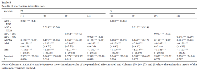 表5的結果顯示,以下交叉項的估計系數均在1%的顯著性水平上顯著:綠色信貸與企業(yè)績效(lnGC×ROE)、綠色信貸與企業(yè)創(chuàng)新(lnGC×TECH)、綠色信貸與產業(yè)結構合理化(lnGC×RIS)、綠色信貸與產業(yè)結構優(yōu)化(lnGC×OIS)。這證實了綠色信貸通過企業(yè)績效、企業(yè)創(chuàng)新和產業(yè)結構升級這三個機制來改善環(huán)境質量,這也是三個研究假設的結果。交叉項的估計系數存在差異:(lnGC×TECH)的估計系數最小,(lnGC×RIS)和(lnGC×OIS)的估計系數較大。這些結果表明,綠色信貸對通過企業(yè)抑制環(huán)境污染的作用。