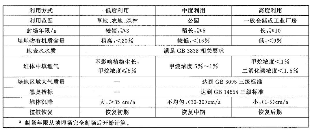表3. GB/T 25179-2010《生活垃圾填埋場穩(wěn)定化場地利用技術(shù)要求》對填埋場場地穩(wěn)定化利用的判定要求
