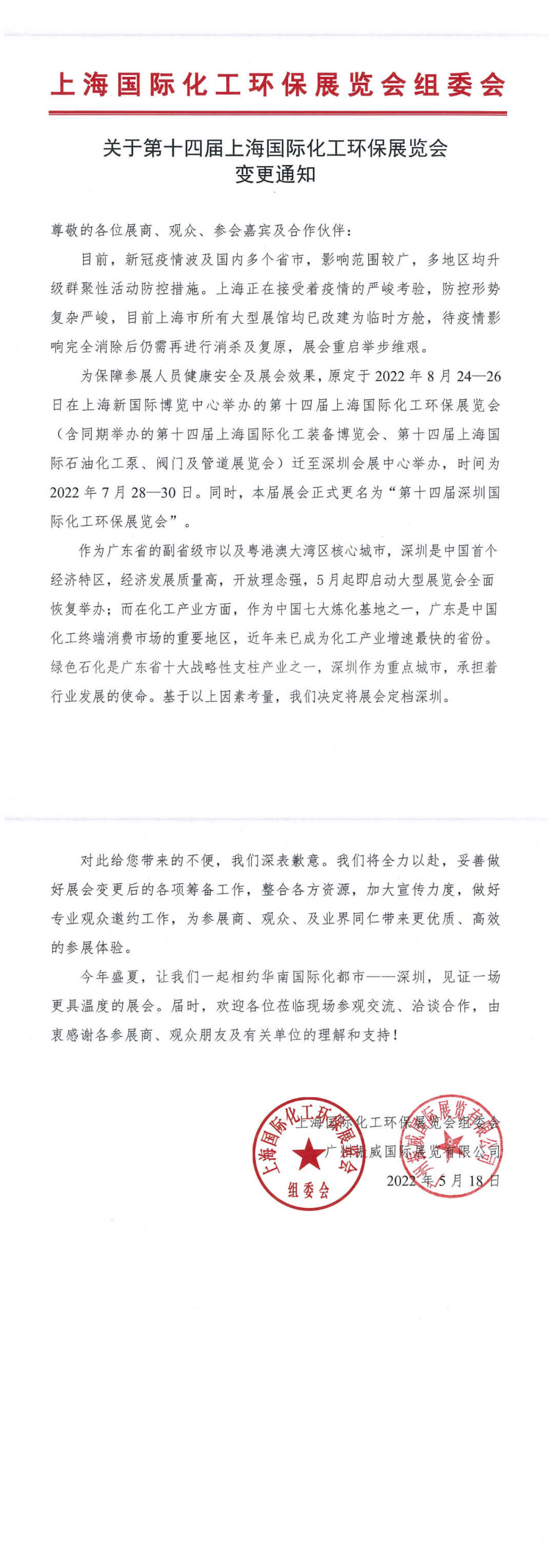 為保障參展人員健康安全及展會(huì)效果,原定于2022年8月24—26日在上海新國際博覽中心舉辦的第十四屆上海國際化工環(huán)保展覽會(huì)(含同期舉辦的第十四屆上海國際化工裝備博覽會(huì)、第十四屆上海國際石油化工泵、閥門及管道展覽會(huì))遷至深圳會(huì)展中心舉辦,時(shí)間為2022年7月28—30日。同時(shí),本屆展會(huì)正式更名為“第十四屆深圳國際化工環(huán)保展覽會(huì)”。