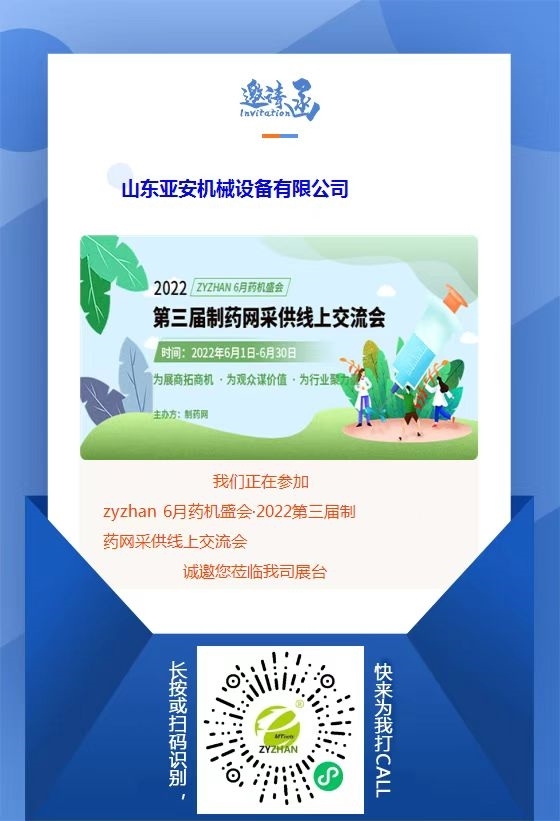 由制藥網(wǎng)舉辦的zyzhan 6月藥機(jī)盛會(huì)——2022第三屆制藥網(wǎng)采供線上交流會(huì)(在線展會(huì)),將于6月1日上午10:00正式拉開帷幕。屆時(shí),山東亞安也將攜大批產(chǎn)品亮相展會(huì),敬請(qǐng)期待!