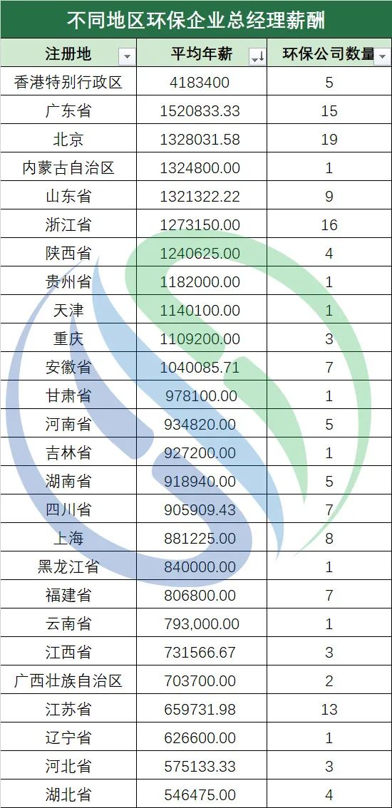 再?gòu)?strong style="margin: 0px;padding: 0px;outline: 0px;box-sizing: border-box !important;overflow-wrap: break-word !important;">企業(yè)注冊(cè)地方面來看,中國(guó)水網(wǎng)所統(tǒng)計(jì)的143家環(huán)保上市公司分別來自26個(gè)省、市、自治區(qū)和特別行政區(qū)。其中,注冊(cè)地位于香港的環(huán)保上市公司總經(jīng)理平均年薪約為418.34萬(wàn)元,遠(yuǎn)高于其它地區(qū),奪得地區(qū)冠軍。廣東、北京緊隨其后,分別以152.08萬(wàn)元與132.8萬(wàn)元位列第二、三名。