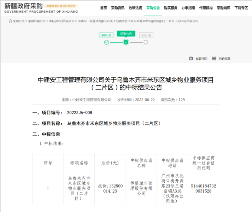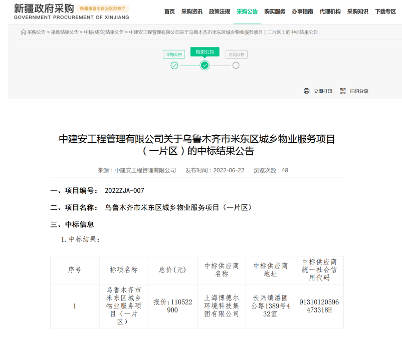 新疆政府采購網(wǎng)消息,2022年6月22日,烏魯木齊市米東區(qū)城鄉(xiāng)物業(yè)服務(wù)項目公布開標結(jié)果,兩個片區(qū)中標合同金額超過24億元,成交情況如下: