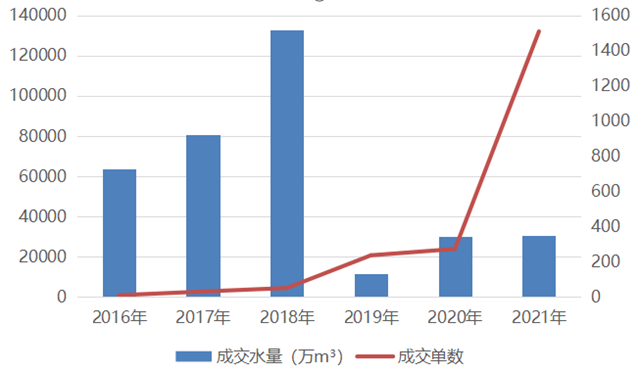 整體而言,2021年成交水量約3億立方米,與2020年成交水量基本相同;同時(shí)成交單數(shù)大幅增長,由2020年的273筆大幅提高至1510筆,顯示交易活躍度顯著改善,覆蓋范圍進(jìn)一步擴(kuò)大。