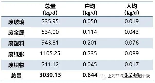 本次調(diào)研有效樣本為168戶家庭。調(diào)研周期內(nèi)共收集可回收物3030.13千克,戶均0.644千克/日,人均0.244千克/日。根據(jù)以上數(shù)據(jù)測(cè)算,按2487.0萬(wàn)常住人口計(jì)算(2021年統(tǒng)計(jì)數(shù)據(jù)),上海居民家庭產(chǎn)生可回收物總量為6068.28噸/日。