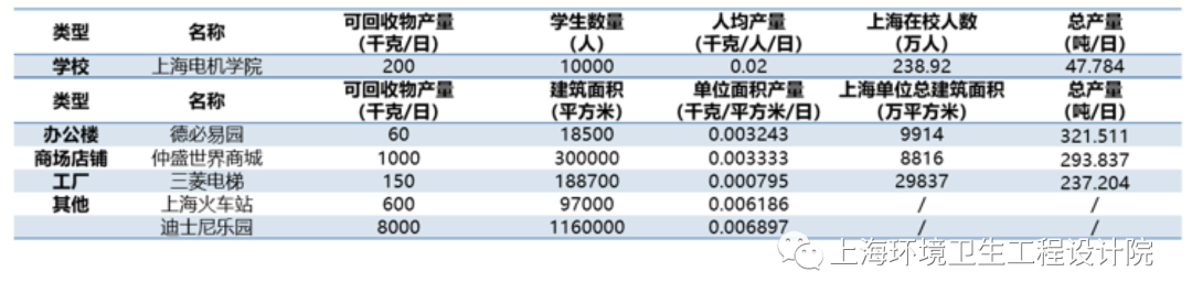 為了解不同類(lèi)型單位可回收物產(chǎn)量,2020年6月-9月本研究團(tuán)隊(duì)開(kāi)展了學(xué)校、辦公樓、商場(chǎng)店鋪、工廠、交通樞紐、游樂(lè)園等6個(gè)典型企事業(yè)單位可回收物產(chǎn)量調(diào)研。