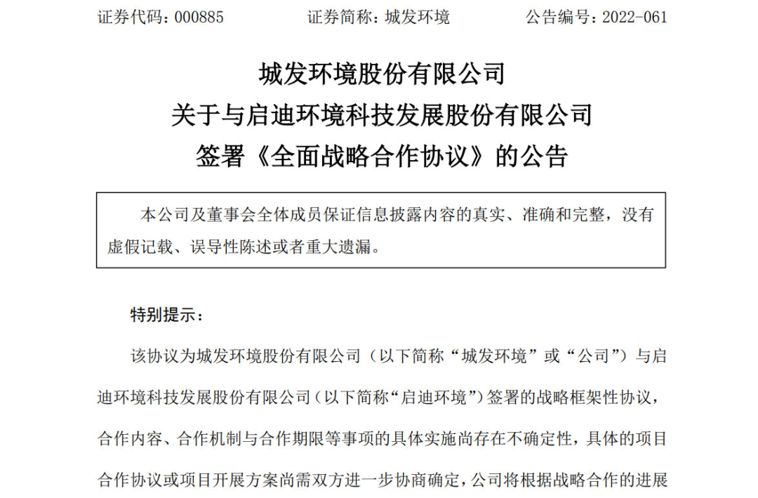 2、城發(fā)環(huán)境:關(guān)于與啟迪環(huán)境科技發(fā)展股份有限公司簽署《全面戰(zhàn)略合作協(xié)議》的公告,城發(fā)環(huán)境,2022-07-21