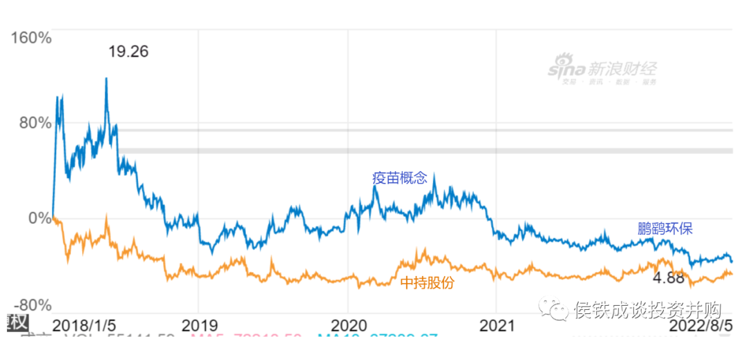 鵬鷂環(huán)保2018年1月份A股上市,增發(fā)8000萬股,融資6個(gè)多億。2018年,公司市值借著行業(yè)東風(fēng)達(dá)到150億,然后環(huán)保行業(yè)一路走低,鵬鷂市值也跟著一路下滑。2020年公司投資了疫苗概念股,市值反彈到80億。概念過后,一路走低到今天的38億。