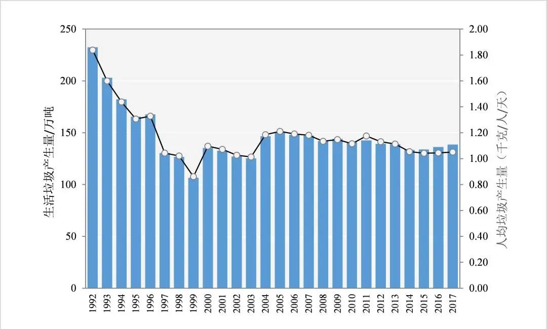 圖1 柏林生活垃圾產(chǎn)生量及人均垃圾產(chǎn)生量趨勢(shì)(1992-2017)