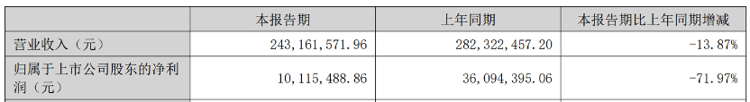 公司上半年度實現(xiàn)營業(yè)收入24,316.16 萬元,同比下降 13.87%;實現(xiàn)歸屬于上市公司股東的凈利潤 1,011.55 萬元,同比下降 71.97%。