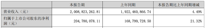 公司上半年營業(yè)收入為20.09億元,同比增長4.49%;歸屬于上市公司股東的凈利潤為2.05億元,同比增長21.32%。