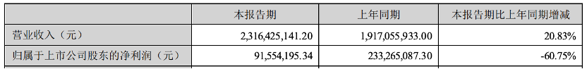 公司上半年營業(yè)收入為23.16億元,同比增長20.83%;歸屬于掛牌公司股東的凈利潤9155.42萬元,同比下降60.75%。