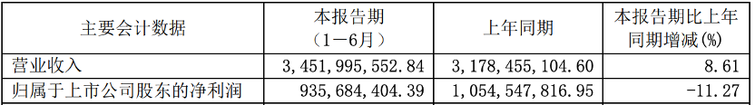公司上半年度實現(xiàn)營業(yè)收入3,451,995,552.84元,同比增長8.61%;實現(xiàn)歸屬于上市公司股東的凈利潤935,684,404.39元,同比下降11.27%。