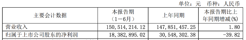 公司上半年營業(yè)收入為150,514,214.12元,同比增長 1.80%;實現(xiàn)歸屬于上市公司股東的凈利潤18,382,895.02元,同比下降39.82%。