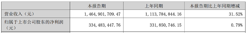 公司上半年營業(yè)收入為14.65億元,同比增長31.52%;歸屬于上市公司股東的凈利潤3.34億元,同比增長0.79%。