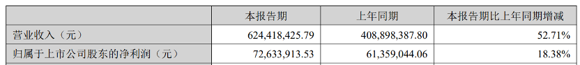 公司上半年營業(yè)收入為6.24億元,同比增長52.71%;歸屬上市公司股東的凈利潤7263萬元,同比增長18.38%。