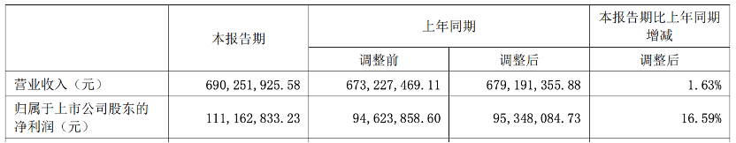 公司上半年營業(yè)收入為入6.90億元,同比增長1.63%;歸屬于上市公司股東的凈利潤1.11億元,同比增長16.59%。