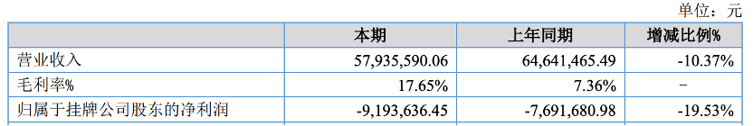 公司上半年營業(yè)收入為57,935,590.06元,同比下降10.37%;歸屬于掛牌公司股東的凈利潤-9,193,636.45元,同比下降19.53%。