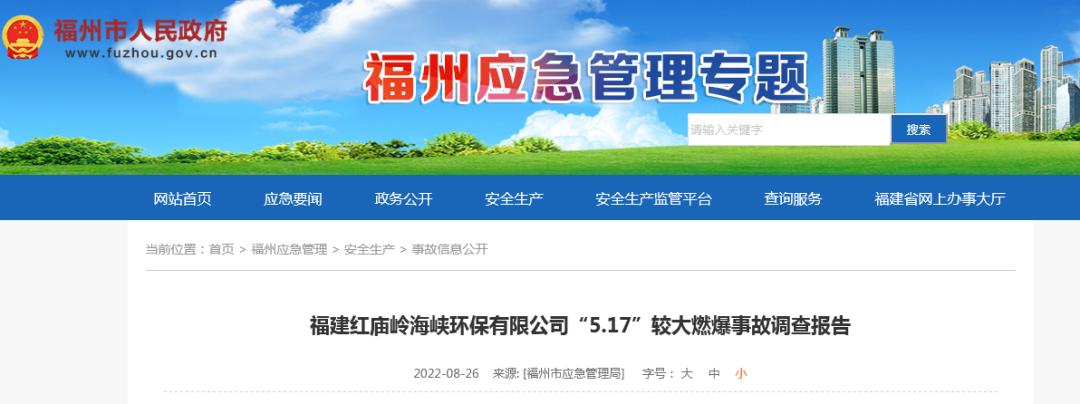 2022年5月17日上午8時(shí)54分,福建紅廟嶺海峽環(huán)保有限公司10萬方調(diào)節(jié)池上方外包作業(yè)人員違規(guī)用氬弧焊對(duì)除臭設(shè)施風(fēng)管漏點(diǎn)進(jìn)行焊接施工時(shí)發(fā)生燃爆,造成3人死亡,3人受傷,5#、6#池頂蓋坍塌,池頂除臭裝置損壞,直接經(jīng)濟(jì)損失約1800萬元。事故發(fā)生后,尹力書記、趙龍省長、郭寧寧常務(wù)副省長、林文斌副省長等領(lǐng)導(dǎo)第一時(shí)間做出重要批示,要求全力搜救失聯(lián)人員,全力搶救受傷人員;嚴(yán)格救援現(xiàn)場(chǎng)管控,防止發(fā)生次生災(zāi)害;查明原因,舉一反三,排查隱患,防范類似事故發(fā)生;做好善后工作。省委常委、市委林寶金書記、省應(yīng)急廳伍斌廳長、吳賢德市長、省建設(shè)廳王明炫副廳長等領(lǐng)導(dǎo)到場(chǎng)指導(dǎo)應(yīng)急救援。省消防救援總隊(duì)高寧宇總隊(duì)長、蘇作琴副總隊(duì)長率領(lǐng)總隊(duì)全勤指揮部到場(chǎng)指揮救援行動(dòng)。林中麟常務(wù)副市長全時(shí)指揮市應(yīng)急局、市消防救援支隊(duì)、市城管委、市衛(wèi)健委、市公安局、晉安區(qū)委區(qū)政府及多支民間救援隊(duì)進(jìn)行現(xiàn)場(chǎng)救援。根據(jù)《生產(chǎn)安全事故報(bào)告和調(diào)查處理?xiàng)l例》(國務(wù)院令第493號(hào)),經(jīng)市政府授權(quán),市應(yīng)急管理局牽頭市城管委、市公安局、市總工會(huì)、晉安區(qū)政府成立市政府福建紅廟嶺海峽環(huán)保有限公司“5.17”燃爆較大事故調(diào)查組(以下簡稱事故調(diào)查組),聘請(qǐng)3名專家參與調(diào)查,并邀請(qǐng)市紀(jì)委監(jiān)委派員參加。事故調(diào)查組按照“四不放過”和“科學(xué)嚴(yán)謹(jǐn)、依法依規(guī)、實(shí)事求是、注重實(shí)效”的原則,通過現(xiàn)場(chǎng)勘查、技術(shù)鑒定、調(diào)查取證、專家論證、人員問詢、調(diào)閱資料、問題核實(shí)和綜合分析,查明了事故發(fā)生的經(jīng)過、原因、應(yīng)急救援、人員傷亡情況和直接經(jīng)濟(jì)損失,認(rèn)定了事故性質(zhì)和責(zé)任,提出了對(duì)相關(guān)責(zé)任人員及責(zé)任單位的處理建議及防范整改措施建議。(一)福建紅廟嶺海峽環(huán)保有限公司。成立于2014年02月21日,注冊(cè)資本為500萬人民幣,法定代表人為徐國丹,經(jīng)營狀態(tài)為存續(xù),工商注冊(cè)號(hào)為350100100368616,注冊(cè)地址為福州市晉安區(qū)鼓山鎮(zhèn)洋里路16號(hào)綜合樓一樓107室,經(jīng)營范圍包括城市污水處理及其再生利用;垃圾滲瀝液收集及處理、環(huán)境污染治理設(shè)施的投資、建設(shè)、運(yùn)營;城市餐廚垃圾處理;環(huán)境污染治理設(shè)施運(yùn)營咨詢服務(wù)及技術(shù)服務(wù)(依法須經(jīng)批準(zhǔn)的項(xiàng)目,經(jīng)相關(guān)部門批準(zhǔn)后方可開展經(jīng)營活動(dòng))。為福建海峽環(huán)保集團(tuán)股份有限公司獨(dú)立法人的全資子公司,10萬方新調(diào)節(jié)池項(xiàng)目的實(shí)際管理單位。(二)福建致辰宇洋環(huán)保科技有限公司。成立于2015年3月12日,注冊(cè)資本為1000萬人民幣,法定代表人為俞果,經(jīng)營狀態(tài)為存續(xù),工商注冊(cè)號(hào)為350100100432860,注冊(cè)地址為福州市晉安區(qū)新店鎮(zhèn)秀山路245號(hào)索高廣場(chǎng)4#樓1層101單元,經(jīng)營范圍包括一般項(xiàng)目:大氣污染治理;水污染治理;生態(tài)環(huán)境監(jiān)測(cè)及檢測(cè)儀器儀表銷售;大氣污染監(jiān)測(cè)及檢測(cè)儀器儀表銷售;海洋水質(zhì)與生態(tài)環(huán)境監(jiān)測(cè)儀器設(shè)備銷售;環(huán)境保護(hù)監(jiān)測(cè);水質(zhì)污染物監(jiān)測(cè)及檢測(cè)儀器儀表銷售等(除依法須經(jīng)批準(zhǔn)的項(xiàng)目外,憑營業(yè)執(zhí)照依法自主開展經(jīng)營活動(dòng))。受福建紅廟嶺海峽環(huán)保有限公司委托對(duì)10萬方新調(diào)節(jié)池進(jìn)行除臭設(shè)施提升。(三)福建省偉邦市政環(huán)保工程設(shè)計(jì)研究院有限公司,成立于2006-04-26,注冊(cè)資本為300萬人民幣,法定代表人為劉建偉,經(jīng)營狀態(tài)為開業(yè),工商注冊(cè)號(hào)為350100100173044,注冊(cè)地址為福州市鼓樓區(qū)工業(yè)路611號(hào)福建高新技術(shù)創(chuàng)業(yè)園主樓4層北6房,經(jīng)營范圍包括市政、環(huán)保工程技術(shù)咨詢、設(shè)計(jì),市政、環(huán)保設(shè)備儀器儀表研發(fā)、推廣、銷售,環(huán)保生物廢水處理劑的研發(fā)、推廣、銷售,市政環(huán)保工程承包建設(shè)。(依法須經(jīng)批準(zhǔn)的項(xiàng)目,經(jīng)相關(guān)部門批準(zhǔn)后方可開展經(jīng)營活動(dòng))。該公司投資入股福建致辰宇洋環(huán)??萍加邢薰境袛埖?0萬方新調(diào)節(jié)池的除臭設(shè)施提升項(xiàng)目;受福建致辰宇洋環(huán)??萍加邢薰镜姆ㄈ舜碛峁?,該公司工程師陳連文負(fù)責(zé)10萬方新調(diào)節(jié)池的除臭設(shè)施提升項(xiàng)目具體管理。(四)福州嘉鑫華強(qiáng)金屬制品有限公司。成立于2018-06-15,注冊(cè)資本為200萬人民幣,法定代表人為羅維嘉,經(jīng)營狀態(tài)為存續(xù),工商注冊(cè)號(hào)為350121100236032,注冊(cè)地址為福建省福州市閩侯縣祥謙鎮(zhèn)林森大道28號(hào),經(jīng)營范圍包括金屬制品、工藝品