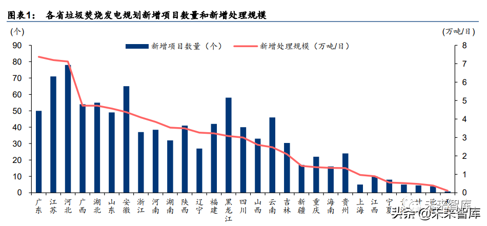 2017 年 12 月 12 日,國(guó)家發(fā)改委聯(lián)合五部委下發(fā)《關(guān)于進(jìn)一步做好生活垃圾焚燒發(fā)電廠規(guī) 劃選址工作的通知》,要求各?。▍^(qū)、市)應(yīng)編制本地區(qū)省級(jí)生活垃圾焚燒發(fā)電中長(zhǎng)期專項(xiàng) 規(guī)劃。截至 2022 年 5 月底,全國(guó)已有 21 個(gè)?。▍^(qū)、市)發(fā)布中長(zhǎng)期專項(xiàng)規(guī)劃及修訂稿, 13 個(gè)?。▍^(qū)、市)相繼發(fā)布涉及生活垃圾焚燒發(fā)電的“十四五”規(guī)劃,整理后得到 29 個(gè) ?。▍^(qū)、市)規(guī)劃新增項(xiàng)目數(shù)量合計(jì) 974 個(gè),新增處理規(guī)模合計(jì) 84.3 萬(wàn)噸/日。其中,規(guī)劃 新增項(xiàng)目數(shù)量前三的省(區(qū)、市)為河北、江蘇和安徽,分別為 78/71/65 個(gè),規(guī)劃新增處 理規(guī)模前三的省(區(qū)、市)為廣東、江蘇和河北,分別為 7.4/7.2/7.1 萬(wàn)噸/日。