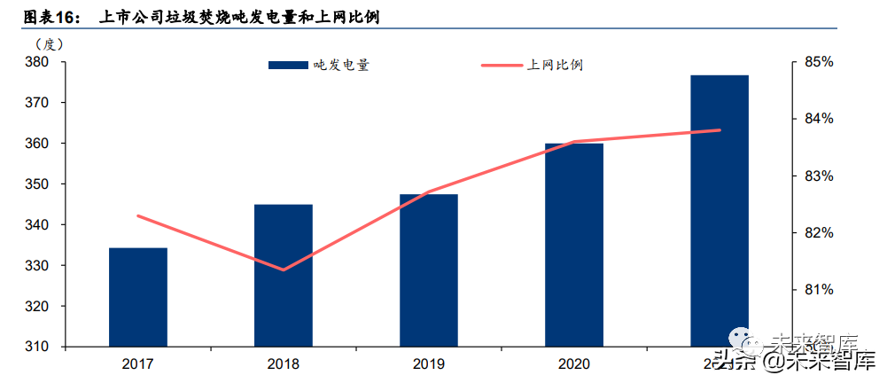 噸發(fā)電量與上網(wǎng)比率的雙重增長(zhǎng)帶動(dòng)噸上網(wǎng)電量顯著提升。將 8 家典型公司的噸發(fā)電量進(jìn) 行整理和計(jì)算,發(fā)現(xiàn) 2017-2021 年噸發(fā)電量由 334 度提升至 377 度,我們認(rèn)為主要有以下 兩方面原因:1)垃圾分類帶動(dòng)入爐垃圾熱值水平上升。廚余垃圾含水量高,熱值較低,而 近年來(lái)垃圾分類在全國(guó)范圍內(nèi)的推廣,使廚余垃圾與生活垃圾相分離,導(dǎo)致入爐焚燒的廚 余垃圾占比減少;2)爐排爐技術(shù)進(jìn)一步推廣。2016 年全國(guó)垃圾焚燒廠中,使用爐排爐技 術(shù)的焚燒爐占比為 78%,2020 年占比已經(jīng)提升至 85%以上,相比于流化床技術(shù),爐排爐 技術(shù)能使垃圾燃燒的更加充分,從而提升噸發(fā)電量,我們預(yù)計(jì) 2022-2025 年噸發(fā)電量為 379/381/383/385 度。另外,隨著行業(yè)整體運(yùn)營(yíng)水平上升,各企業(yè)致力于生產(chǎn)環(huán)節(jié)節(jié)能降耗, 降低廠用電率,行業(yè)整體上網(wǎng)比率也持續(xù)增長(zhǎng),2018-2021 年間由 81.3%增長(zhǎng)至 83.8%, 我們預(yù)計(jì) 2022-2025 年上網(wǎng)比例逐年提升 0.2 個(gè)百分點(diǎn)至 84.6%。以上雙重因素帶動(dòng)噸上 網(wǎng)電量顯著提升。