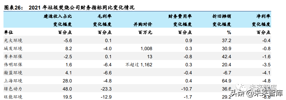 財(cái)務(wù)費(fèi)用和折舊攤銷影響下,產(chǎn)能增長(zhǎng)有望穩(wěn)定盈利水平。2021 年偉明環(huán)保和城發(fā)環(huán)境均 實(shí)施了較大規(guī)模的并購(gòu),并購(gòu)交易對(duì)價(jià)分別為不超過(guò) 11.62/10.08 億元,其財(cái)務(wù)費(fèi)用率同比 均有小幅提升,我們認(rèn)為,并購(gòu)在短期會(huì)帶來(lái)財(cái)務(wù)費(fèi)用增長(zhǎng),但投運(yùn)產(chǎn)能的不斷增加將提 供穩(wěn)健現(xiàn)金流,改善公司財(cái)務(wù)結(jié)構(gòu),有望消除財(cái)務(wù)費(fèi)用增加的短期影響。綠色動(dòng)力由于首 次確認(rèn)建造收入和固廢業(yè)務(wù)增長(zhǎng),2021 年?duì)I業(yè)收入同比+122%,因此財(cái)務(wù)費(fèi)用率下降 10.7pp。新增投運(yùn)產(chǎn)能帶來(lái)折舊攤銷上漲,項(xiàng)目投運(yùn)初期產(chǎn)能利用率較低,盈利能力相對(duì) 較低,我們認(rèn)為,投運(yùn)項(xiàng)目產(chǎn)能度過(guò)爬坡期之后,盈利能力可達(dá)到穩(wěn)定狀態(tài)。