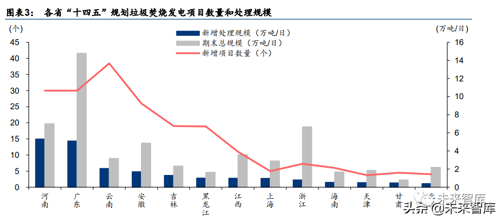 “十四五”規(guī)劃提出,到 2025 年底,全國(guó)城鎮(zhèn)生活垃圾焚燒處理能力達(dá)到 80 萬(wàn)噸/日左右, 相對(duì)“十三五”末期增量空間為 22 萬(wàn)噸/日;城市生活垃圾焚燒處理能力占比 65%左右,相對(duì) “十三五”末期提升空間仍有 20 個(gè)百分點(diǎn)。此外 13 個(gè)?。▍^(qū)、市)相繼發(fā)布涉及生活垃圾焚 燒發(fā)電的“十四五”規(guī)劃,結(jié)合國(guó)家統(tǒng)計(jì)局公布的 2020 年生活垃圾焚燒發(fā)電產(chǎn)能數(shù)據(jù),我 們測(cè)算得到“十四五”期間 13 個(gè)?。▍^(qū)、市)規(guī)劃新增垃圾焚燒項(xiàng)目 204 個(gè),新增產(chǎn)能 21.2 萬(wàn)噸/日,其中,規(guī)劃新增處理規(guī)模前二的?。▍^(qū)、市)為河南和廣東,分別為 5.3/5.1 萬(wàn)噸/日,對(duì)應(yīng)規(guī)劃新增項(xiàng)目數(shù)量均為 30 個(gè)。