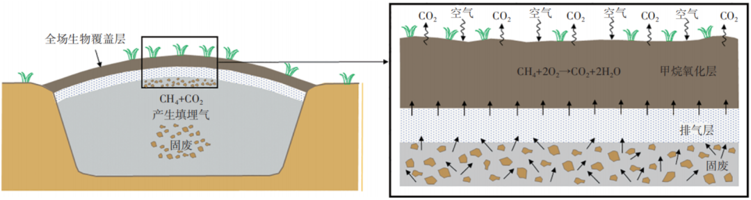 生態(tài)型土質(zhì)覆蓋層具有良好的閉氣功能,能夠有效降低填埋氣排放。同時(shí)由于土體多孔的特性,生態(tài)型土質(zhì)覆蓋層不會(huì)完全阻斷填埋氣向大氣遷移,而且覆蓋層土壤中廣泛存在分解污染性填埋氣的微生物,這些微生物以污染性填埋氣為“糧食”,能夠?qū)崿F(xiàn)填埋場長效碳減排(圖6)。