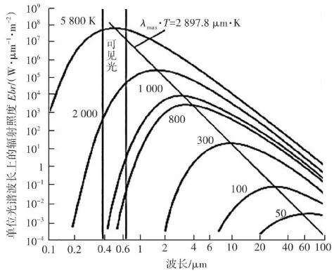 根據(jù)Wien定律,我們可以估算,當(dāng)T=6 000 K時(shí),λmax為0.48 μm(綠色),這就是太陽(yáng)輻射中大致的最大光譜輻射亮度處。當(dāng)T=300 K,λmax=9.6 μm,這就是地球物體輻射中大致最大光譜輻射亮度處。普朗克定律描述的黑體輻射在不同溫度下的頻譜見(jiàn)圖5。