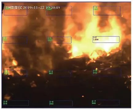 圖6中所示藍(lán)色方框區(qū)域內(nèi)綠色數(shù)字為該點(diǎn)區(qū)域?qū)?yīng)的火焰實(shí)時(shí)溫度,該畫(huà)面選取了12個(gè)紅外溫度測(cè)點(diǎn)。圖6中第1行、第2行測(cè)點(diǎn)溫度值均在1 000 ℃以上,第3行溫度基本在950 ℃左右,第4行溫度在900 ℃左右。第2行的第3個(gè)測(cè)點(diǎn)的溫度最高,為1 204 ℃,所在測(cè)點(diǎn)位置的火焰也最為光亮刺眼,系統(tǒng)隨之發(fā)出了報(bào)警提示,溫度數(shù)字由綠色變?yōu)榧t色。由實(shí)例可見(jiàn),測(cè)點(diǎn)反饋溫度值與實(shí)際的火焰狀況可以正確關(guān)聯(lián)。