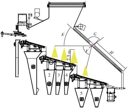 對(duì)應(yīng)的爐膛火焰監(jiān)視器安裝示意如圖2所示。爐膛火焰探頭安裝在焚燒爐后墻,安裝位置與后墻觀火平臺(tái)地面距離為C(m)。開(kāi)孔傾角與水平方向夾角為B(°),有效視場(chǎng)角為A(°)。圖2中由黃色填充的三角形區(qū)域代表正常燃燒火焰,其中標(biāo)注高度2.5 m的區(qū)域?yàn)槿紵隣t排尾部火焰,即為圖1所顯示的火焰鋒面。顯然,從爐膛火焰監(jiān)視器向上望去,燃燒段前部、中部火焰為視野盲區(qū)。由于被燃燒段尾部火焰鋒面遮擋,通過(guò)火焰監(jiān)視器通常只能看到燃燒段尾部、燃燼段前部這兩個(gè)區(qū)域的火焰。