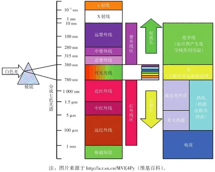 根據(jù)普朗克(Plank)黑體輻射定律,自然界的任何物體只要溫度高于絕對(duì)零度(-273.15 ℃),就會(huì)以電磁輻射的形式在非常寬的波長(zhǎng)范圍內(nèi)發(fā)射能量,產(chǎn)生電磁波(輻射能)。不同的材料、溫度、表面光度及顏色,發(fā)出的紅外輻射強(qiáng)度都不同,大氣電磁光譜示意見(jiàn)圖4。