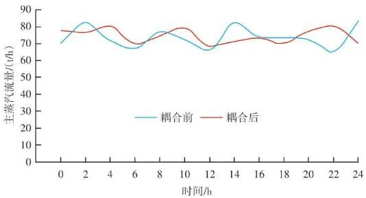 焚燒爐主蒸汽流量曲線如圖11所示,左側(cè)縱坐標(biāo)為主蒸汽流量,額定蒸發(fā)量74 t/h。圖中藍(lán)色實(shí)線為紅外熱成像系統(tǒng)與ACC系統(tǒng)耦合前24 h的主蒸汽流量曲線,紅色虛線為紅外熱成像系統(tǒng)與ACC系統(tǒng)耦合后24 h的主蒸汽流量曲線。