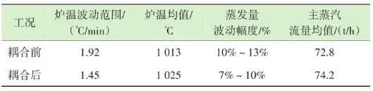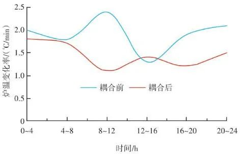 如圖10所示,藍(lán)色實(shí)線為耦合前24 h變化率波動(dòng)范圍,紅色實(shí)線為耦合后24 h變化率波動(dòng)范圍。爐溫變化率指的是焚燒爐上、中、下3層共計(jì)9個(gè)溫度測(cè)點(diǎn)的熱電偶反饋溫度在每分鐘內(nèi)升高或降低的溫度值,而溫度變化率波動(dòng)范圍指的是單位時(shí)間內(nèi)溫度變化率最高值與最低值之間的溫度差,該差值越大表明爐溫波動(dòng)越大,即工況越不穩(wěn)定,波動(dòng)范圍越小表明工況越平穩(wěn)。此期間溫度也一直未低于環(huán)保部要求的最低限(850 ℃/2 s),均介于950~1 050 ℃。
