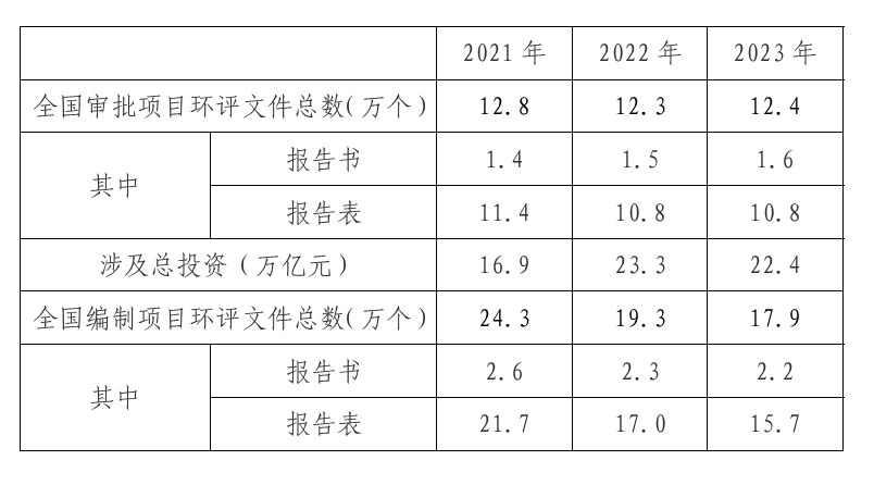 2023年全國(guó)共審批項(xiàng)目環(huán)評(píng)文件12.4萬(wàn)個(gè),同前兩年基本持平。近三年全國(guó)審批及編制環(huán)評(píng)文件數(shù)量情況見(jiàn)表1。表1 近三年全國(guó)審批及編制環(huán)評(píng)文件數(shù)量統(tǒng)計(jì)