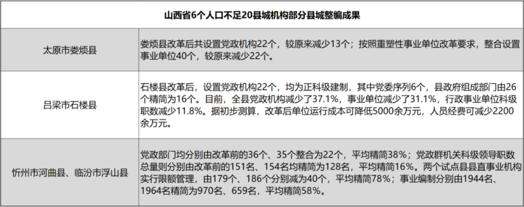 前兩年,安徽、湖南、山西、青海早早就開啟了人口小縣機構(gòu)編制改革,多個行政部門被撤,部分事業(yè)單位編制被縮減,有的縣域縮編人數(shù)甚至超過千人。