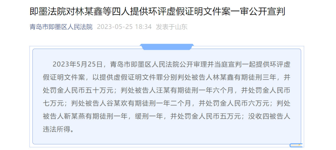 ▼“山東錦華環(huán)評(píng)造假案”宣判。圖片來(lái)源:青島市即墨區(qū)人民法院