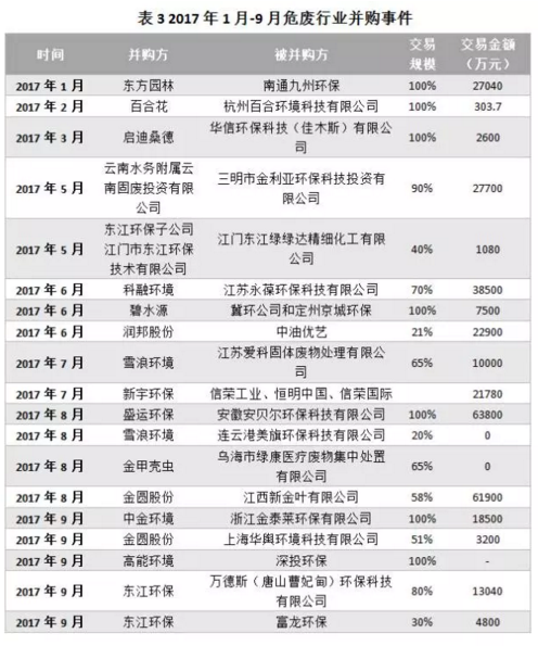 根據(jù)已有公開數(shù)據(jù)的不完全統(tǒng)計,截至2017年9月,2017年危廢行業(yè)發(fā)起并購行為19起起,累積交易金額32.46億元,并購方既包括像東江環(huán)保、啟迪桑德、新宇環(huán)保這樣的“行業(yè)老兵”,也不乏碧水源、盛運環(huán)保、中金環(huán)境等“后起之秀”,更有金圓股份等“跨界來者”。