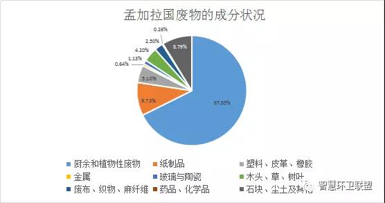 從圖表中可以看出,在孟加拉國的廢物中,有機(jī)成分占了很大的比例,超過了70%,導(dǎo)致廢物不僅含水量很高(超過50%),熱值也很低(小于1000千卡/千克)。